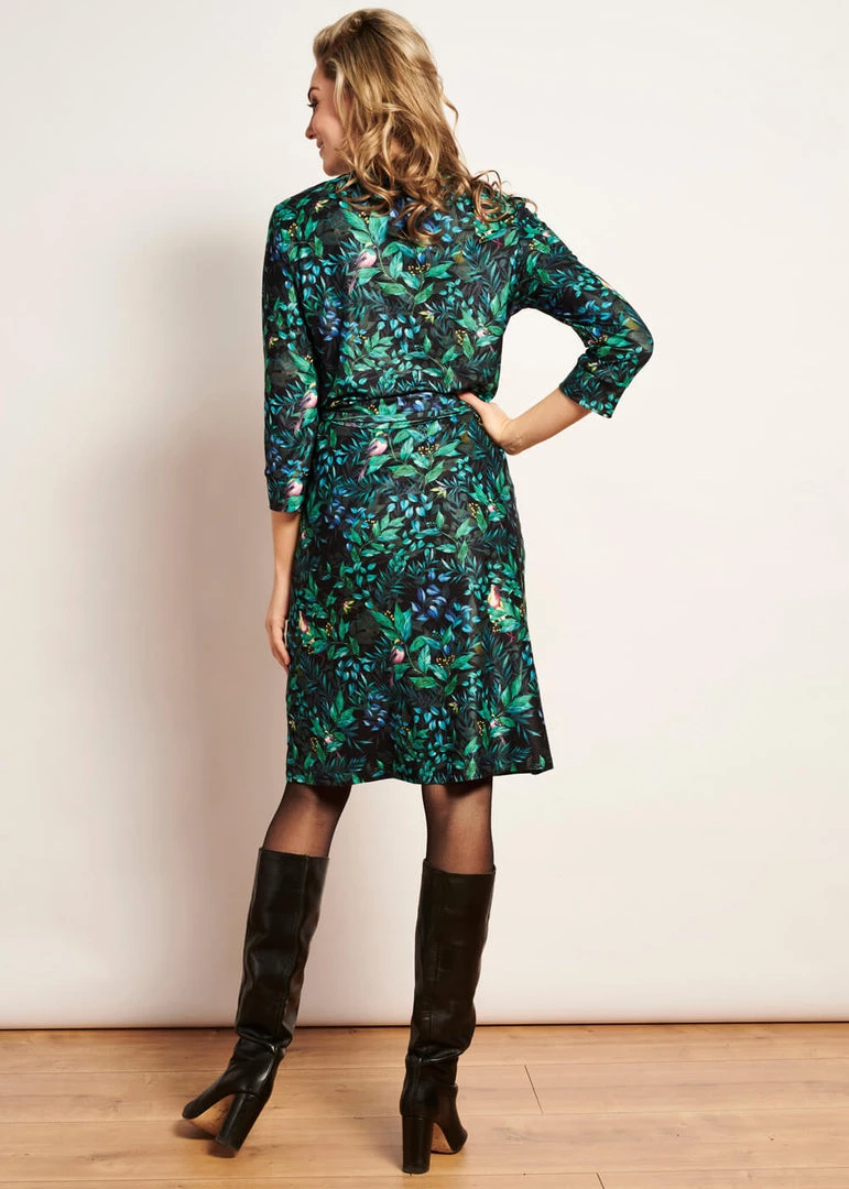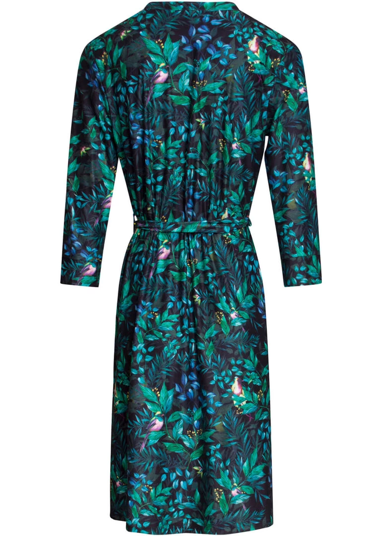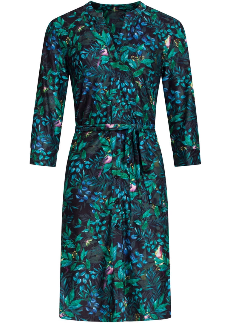 Peacefully they’re sitting inbetween the leaves, in breathtaking shades of green and blue, on a stretchy fabric that feels nice and soft. The model is like a shirt, with buttons all over the front, which she closes with.