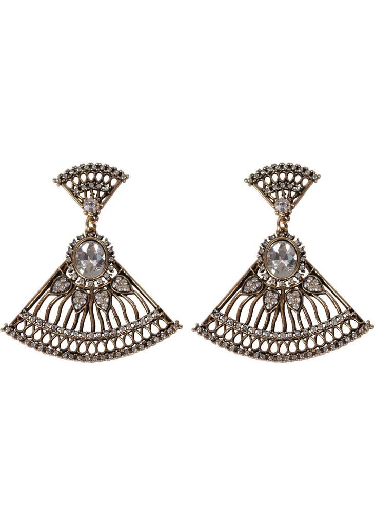 Met haar waaier vorm is ze perfect geschikt voor zowel de jaren ’20 als ’40, maar eigenlijk tijdloos elegant! Deze stekertjes hebben een brons/gouden kleurtje, waardoor ze gelijk al vintage ogen. Het kristal en in het midden is een opvallend detail, dat wordt bijgestaan door talloze kleine kunstdiamantjes. De boven- en onderkant zitten met een ringetje vast, waardoor ze niet stijf aanvoelen.