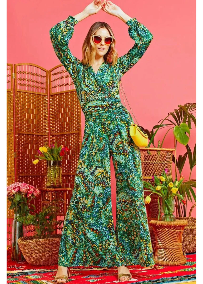 The bodice has a wrap and an elegant draping because of the pleats by the shoulders. From there, she flares into wide trouserlegs with pockets, which sway along to your every step. Stylish with some pumps, but incredibly cool with some 70’s platforms!