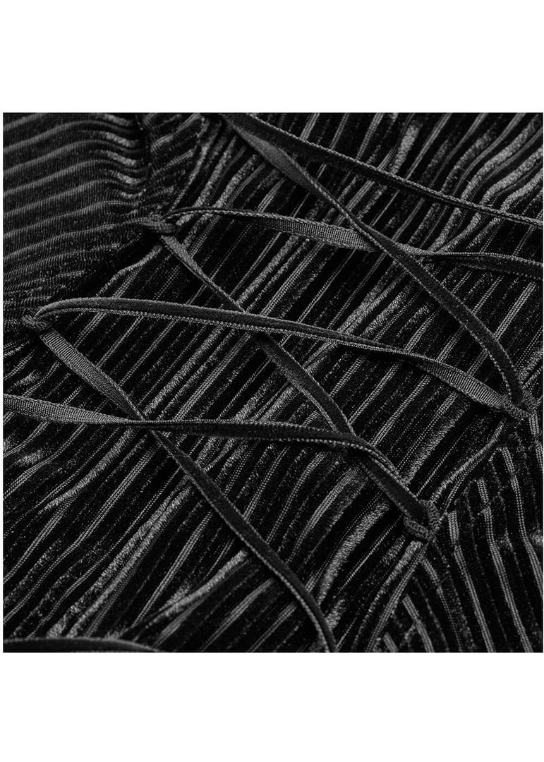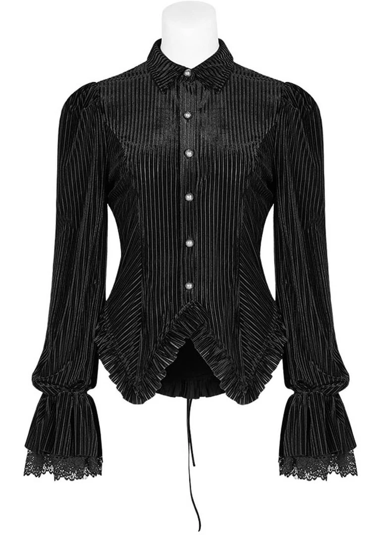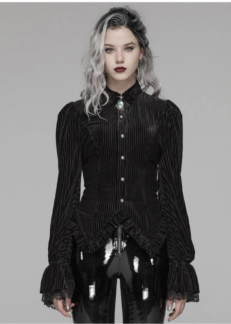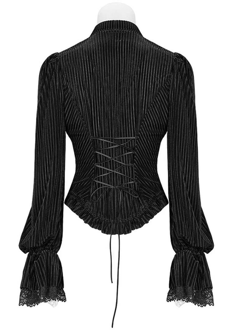She is loaded with details, from the flaring sleeves with lace to the pointy hem… Her soft striped velvet with slight stretch is a dream to wear and has a lovely fit thanks to the princess seams and the lacing in the back. She closes with eleant buttons in the front. The gem in the pictures with the model is not part of the blouse.