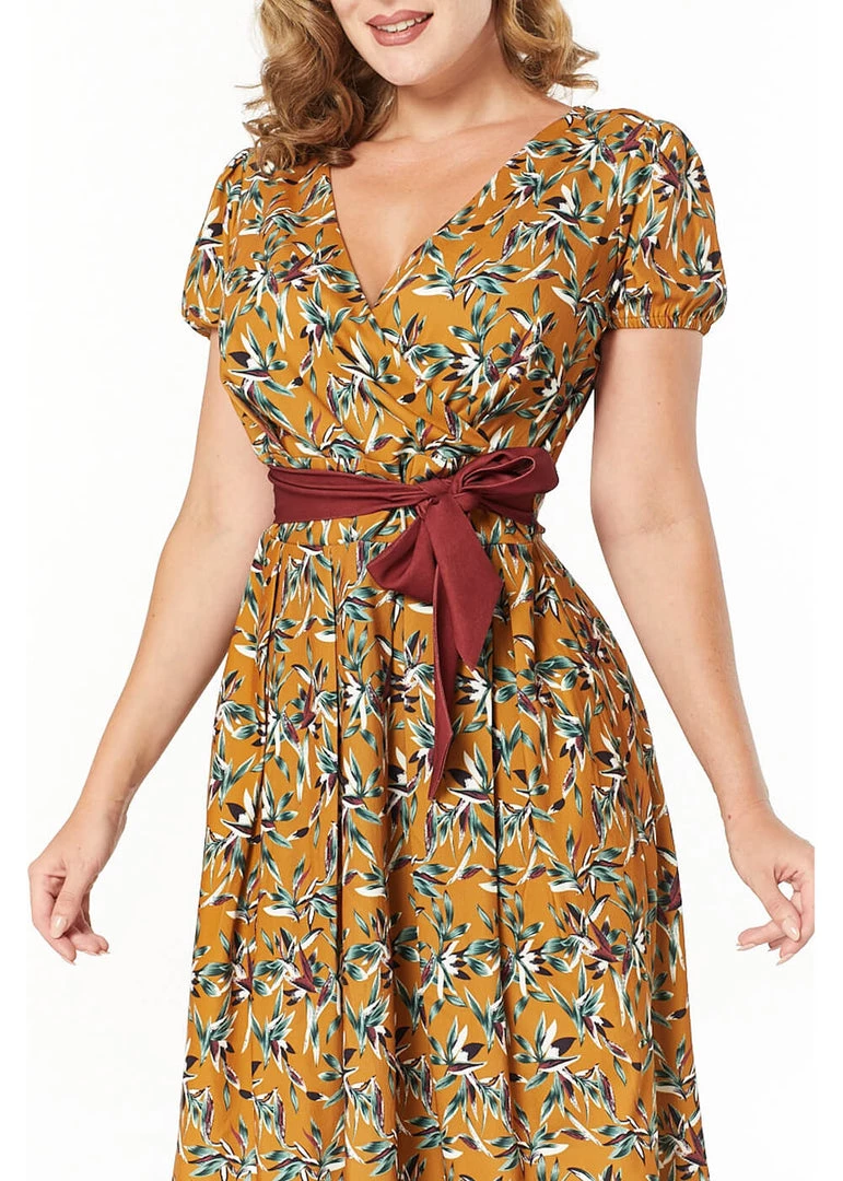 Libby is just as timeless, with her retro caramel-brown colour and the flowerprint. The overlap on the chest and the pleated top make for a vintage-look that is as elegant as ever. Made of a smooth fabric with slight stretch, she’s so great to wear that she’ll never be in your closet for long!