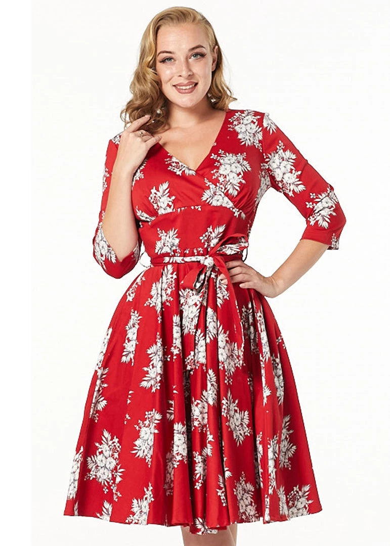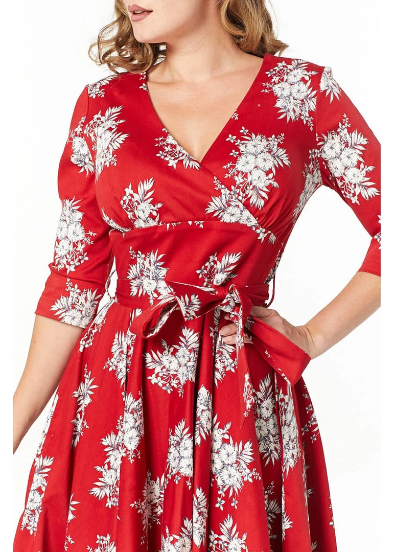 With her light flower pattern on the warm red background and 3/4 sleeves, she is everything we wish for this autumn and winter. She has an overlap on the chest and small gatherings above the waistband for a classic 50’s look. this beauty is made of a fine cotton-mix with slight stretch and is so great to wear that she’ll never be in the closet for long 😉