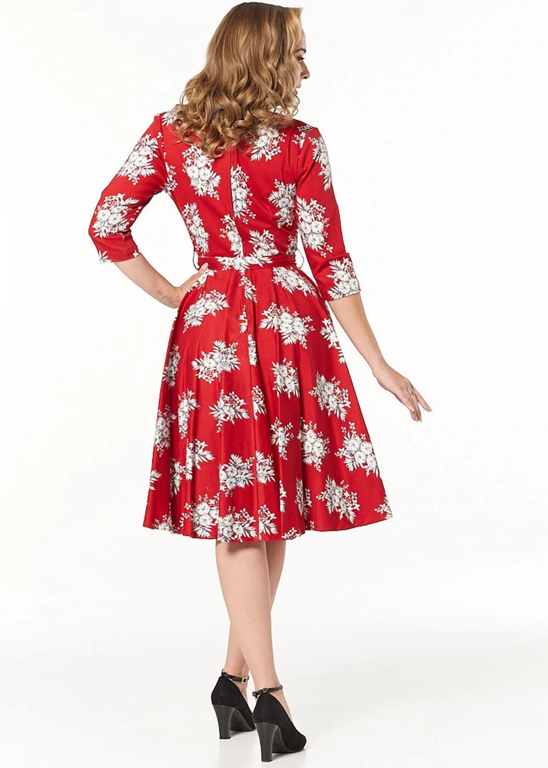 The waist is accentuated with the sash, from where the model flares into a full skirt with pockets. Perfect to wear her with one of our petticoats to have the flowers bloom! For a height of 1.70 m, she ends around the knees, and she closes with a zipper in the back.