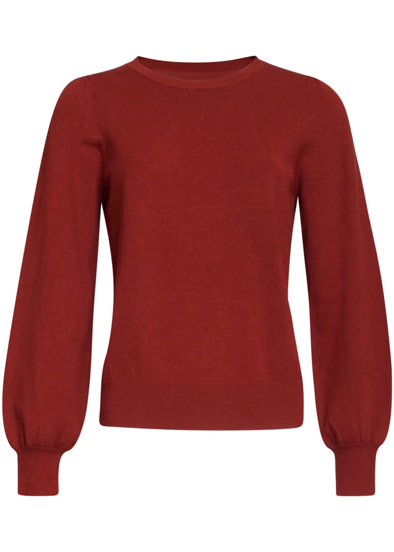 Well too bad for them, this cutie is ours! The warm colour and the puffy long sleeves are perfect for autumn. She is made of a mix with knitted viscose, which gives her slight stretch and makes her feel incredibly soft. The lower seam and the ends of the sleeves are ribbed for a nice fit and to keep the warmth in. She is long enough to wear her with trousers, but also very flirty on top of a high waist model.
