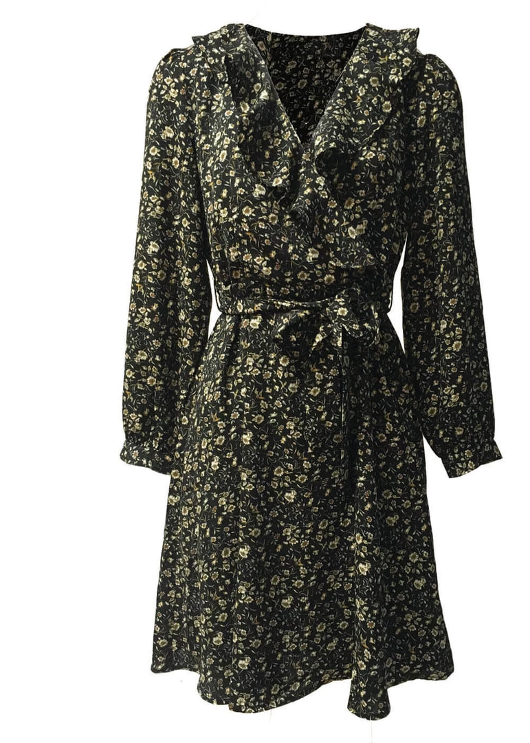 She feels summery, yet cozy with her fragile flowers… The beautifully decorated fabric without stretch looks like crêpe, for a vintage look you can’t get out of your head. Especially with the lovely overlap by the chest! The waist is accentuated with the sash, before she flares into a lightweight skirt, that for a height of 1.70 m ends around the knees. The underdress makes sure that you don’t show more than you want.