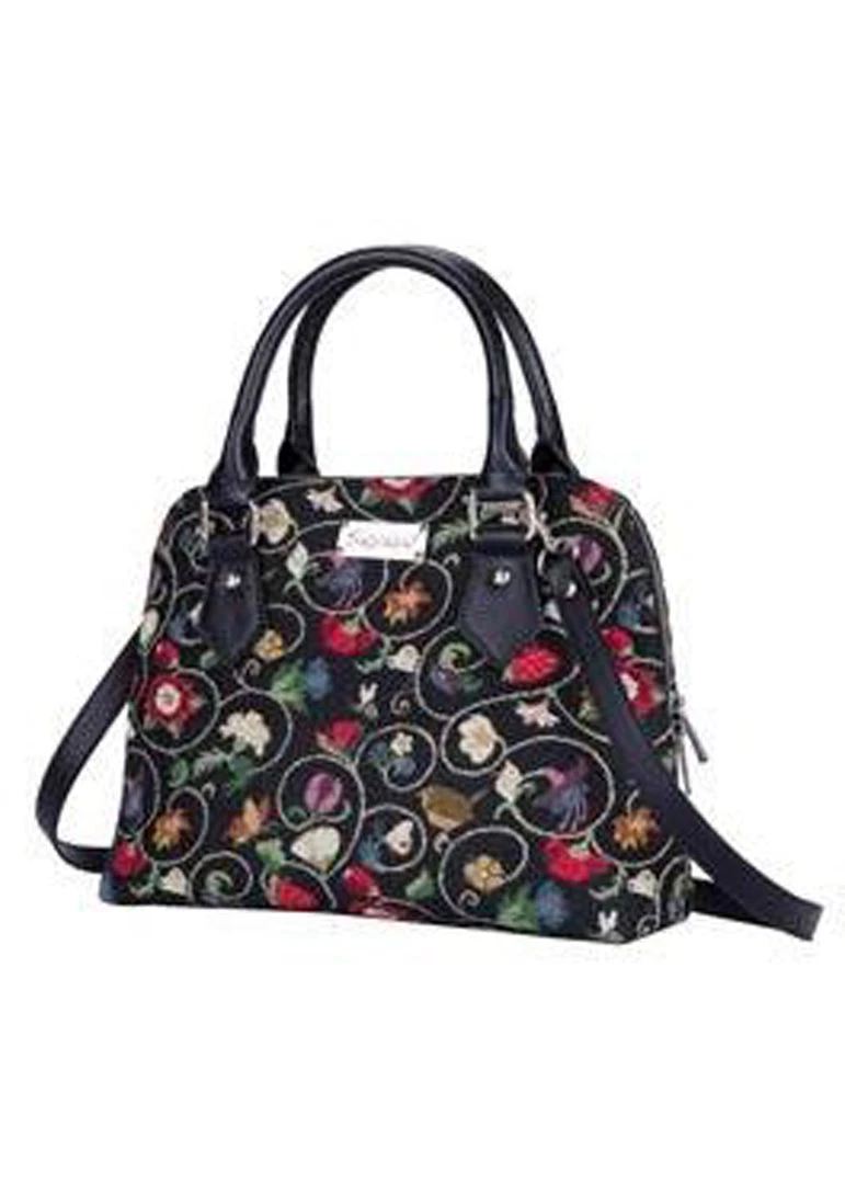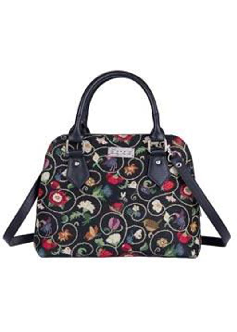 The outside is adorned with a classic pattern of ‘Jacobean Dream’ on fabric, which is inspired by a hat in the Shakespeare Birthplace Trust Collection. The bag closes with a zipper all around and has studs as feet at the bottom.