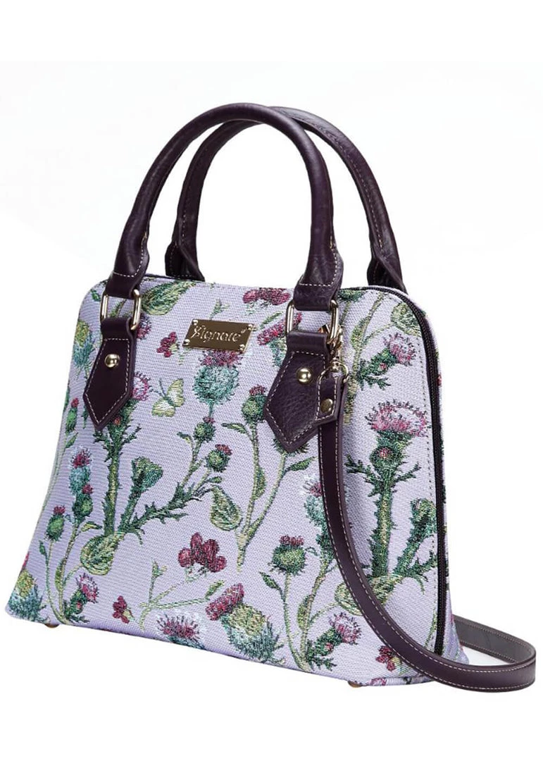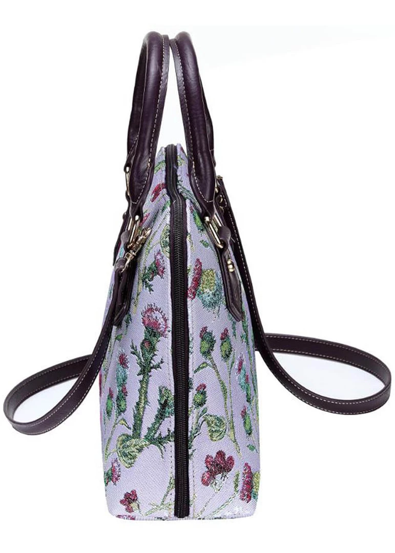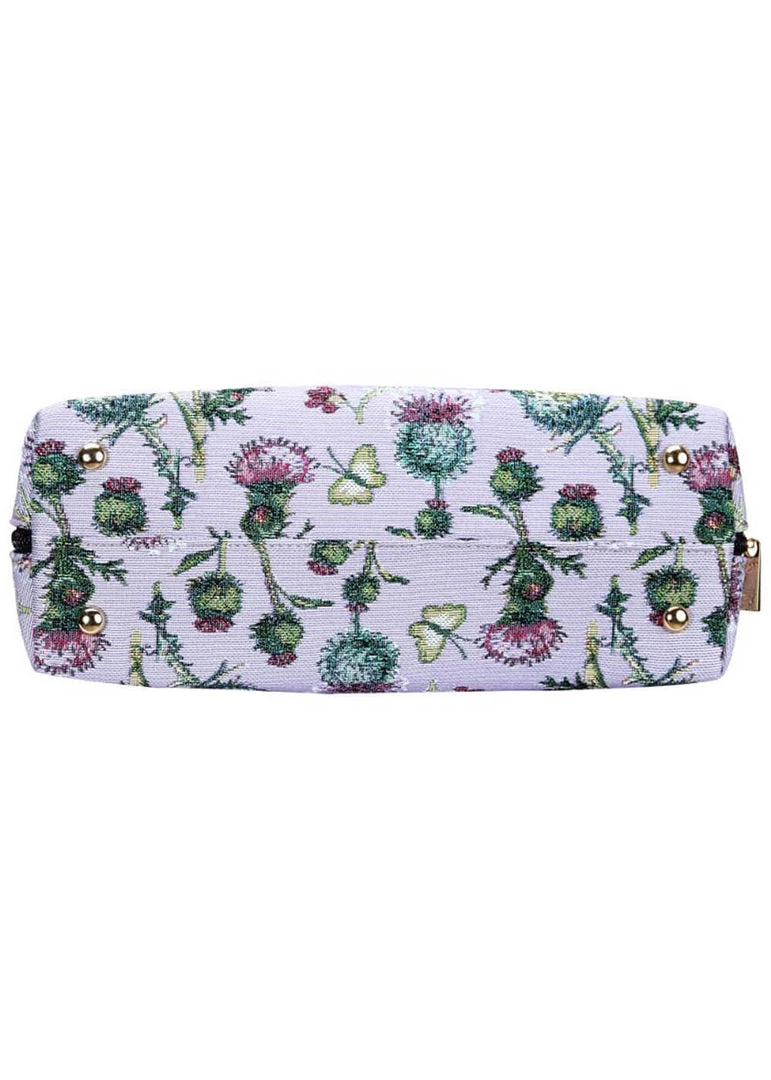 The outside is adorned with a classic pattern of thistles, the national flower of Scotland, on fabric. The bag closes with a zipper all around and has studs as feet at the bottom.