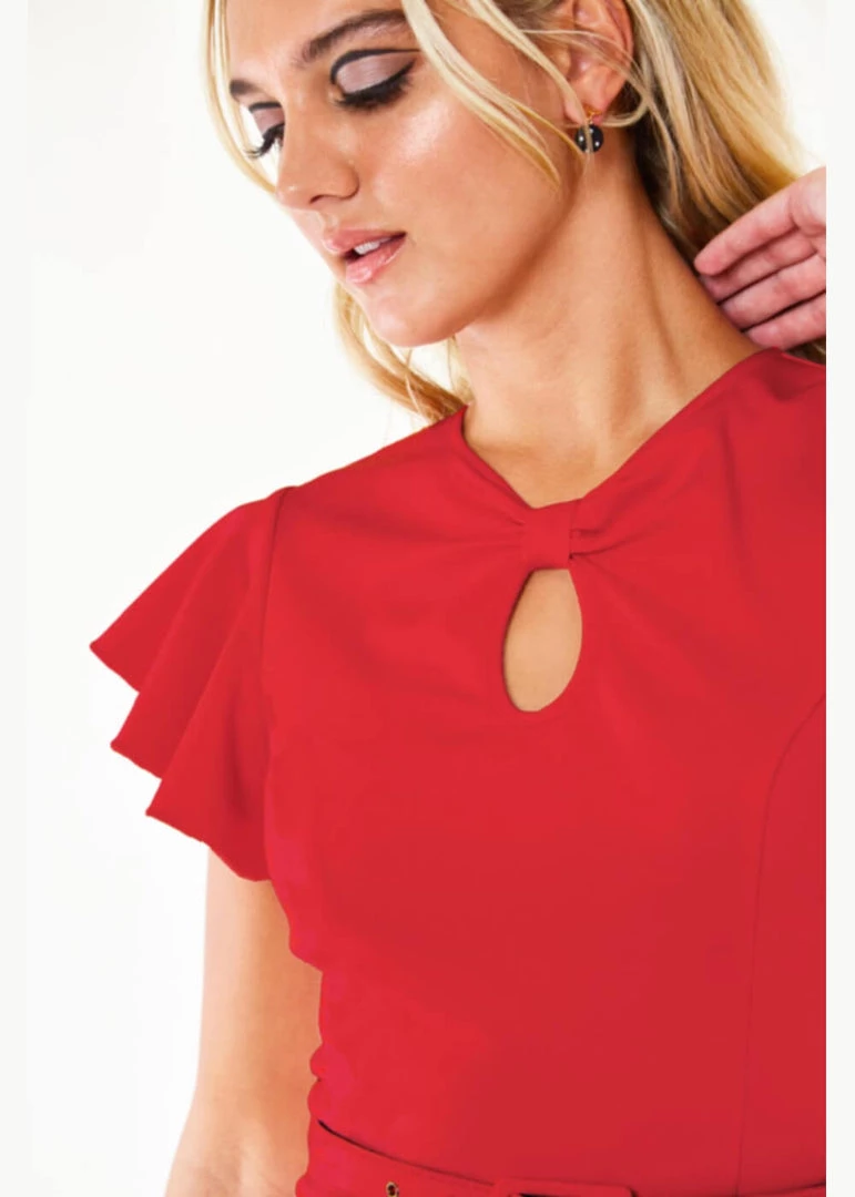 The waist is accentuated with the removable belt, from where she flares slightly at first, and a little more towards the bottom seam. She closes with a zipper in the back and for a height of 1.70 m, she ends around the knees or just below.