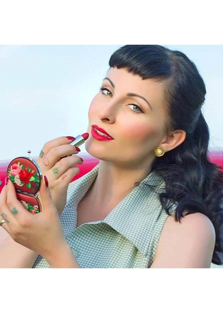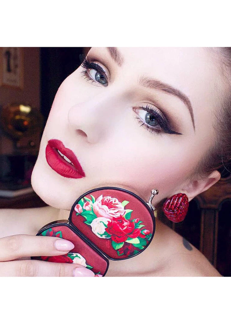 We can’t do without: a good mirror in our bag! This beauty has a normal side as well as a magnifying one. The microfiber outside has both sides showing the gorgeous artwork, which comes out perfectly thanks to the silver coloured kiss-lock.